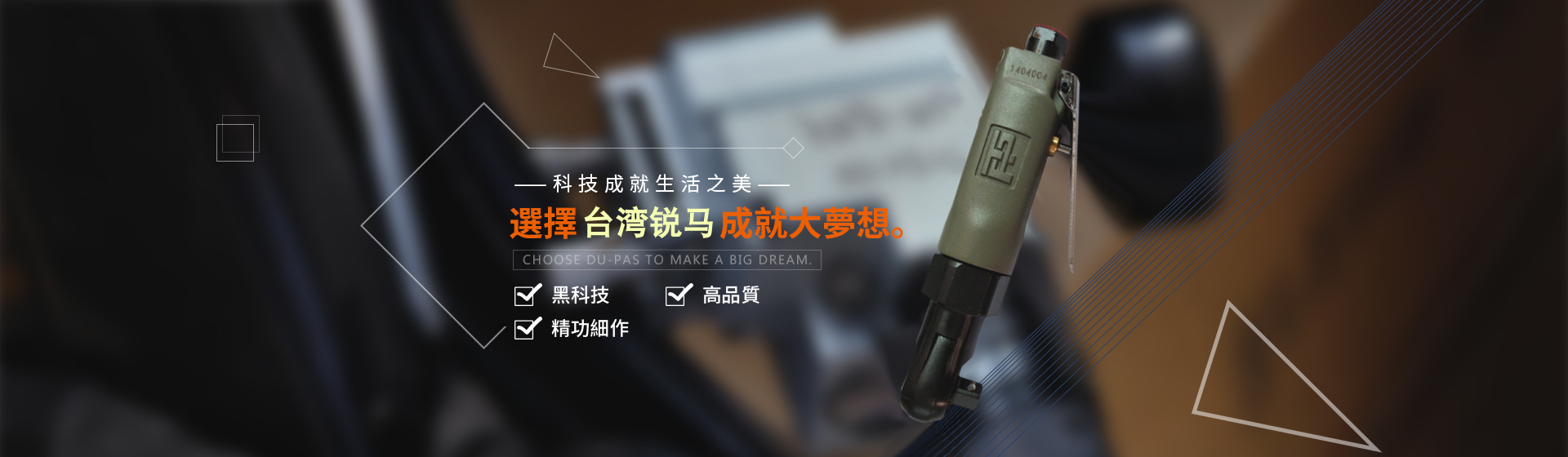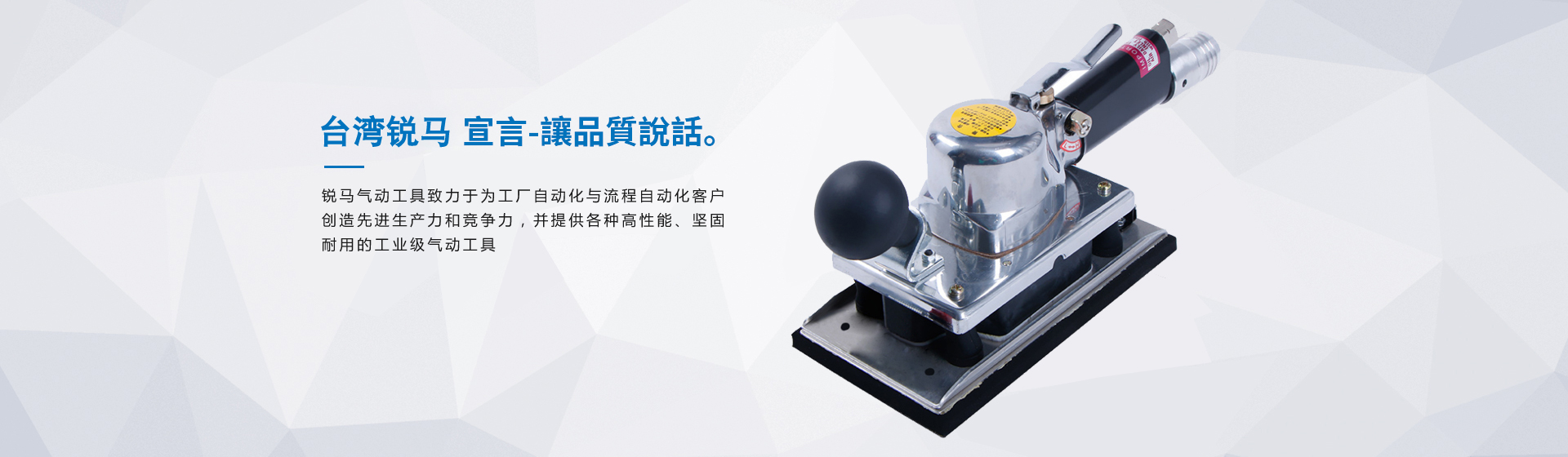 為給廣大客戶提供更加優(yōu)質(zhì)完善的服務(wù),臺灣銳馬氣動(dòng)工具于2001年進(jìn)入中國大陸市場,并以100%臺灣原裝進(jìn)口氣動(dòng)工具在大陸銷售銳馬、杜派氣動(dòng)工具以及充電式電動(dòng)工具。